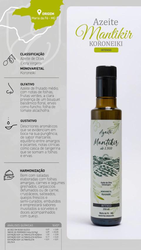 Esses prêmios destacam a excelência do azeite Mantikir, produzido na Serra da Mantiqueira, em um dos olivais mais altos do mundo, e os colocam em um patamar de reconhecimento internacional. O terroir da região contribui para a complexidade e o perfil sensorial único deste azeite.