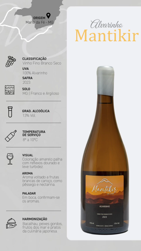 APRESENTAÇÃO: Sinta a brisa do mar em cada gole. Nosso Alvarinho Mantikir é um vinho fino branco seco que conquistou o paladar dos especialistas em quatro prêmios nacionais e internacionais no ano de 2024, e agora é sua vez de experimentar. Com notas voltadas às frutas brancas de caroço, como pêssego e nectarina e um final de boca refrescante, este vinho é a combinação perfeita para dias únicos onde harmoniza com bacalhau, peixes gordos, frutos do mar e culinária japonesa. É a expressão máxima da elegância.