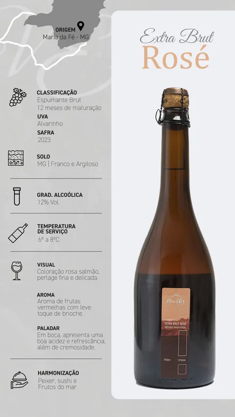 Espumante Extra Brut Rosé de Pinot Noir -🥉 Bronze (Decanter) Reino Unido – Seco, sofisticado e delicadamente frutado.
