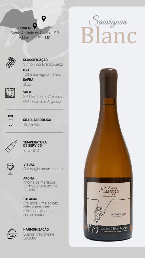 Desvende a paixão em cada gole. Nosso Sauvignon Blanc é um vinho fino branco seco duas vezes premiado internacionalmente, te convida a uma jornada sensorial única. Notas de maracujás cítricos e leve grama cortada com um corpo médio, com uma acidez refrescante e com retrogosto longo fazem deste vinho uma experiência inesquecível. Produzido nas melhores terras de São Paulo e Minas Gerais, ele é a escolha perfeita para momentos especiais, harmonizando com sushis, ceviches e saladas.